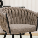 Oblazinjen stol Zoe navdušuje že nekaj sezon. Pletenice, nameščene na črnem okvirju, naredijo izdelek vizualno privlačen. Izžareva moderen, minimalističen slog, ki se popolnoma prilega trenutnim trendom notranje opreme. Edinstven dizajn stola združuje funkcionalnost in estetiko ter ustvarja kos pohištva, ki se prilega različnim notranjim stilom. Stol bo odlična dopolnitev sodobnega interierja, kjer prevladujejo preprostost oblik in zamolkle barve. Poleg tega se bo stol z bež tkanino bucle popolnoma prilegal klasični notranjosti, ta odtenek tkanine pa bo ustvaril nevtralno osnovo v aranžmaju.