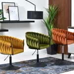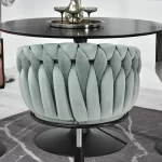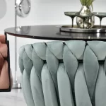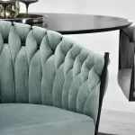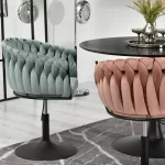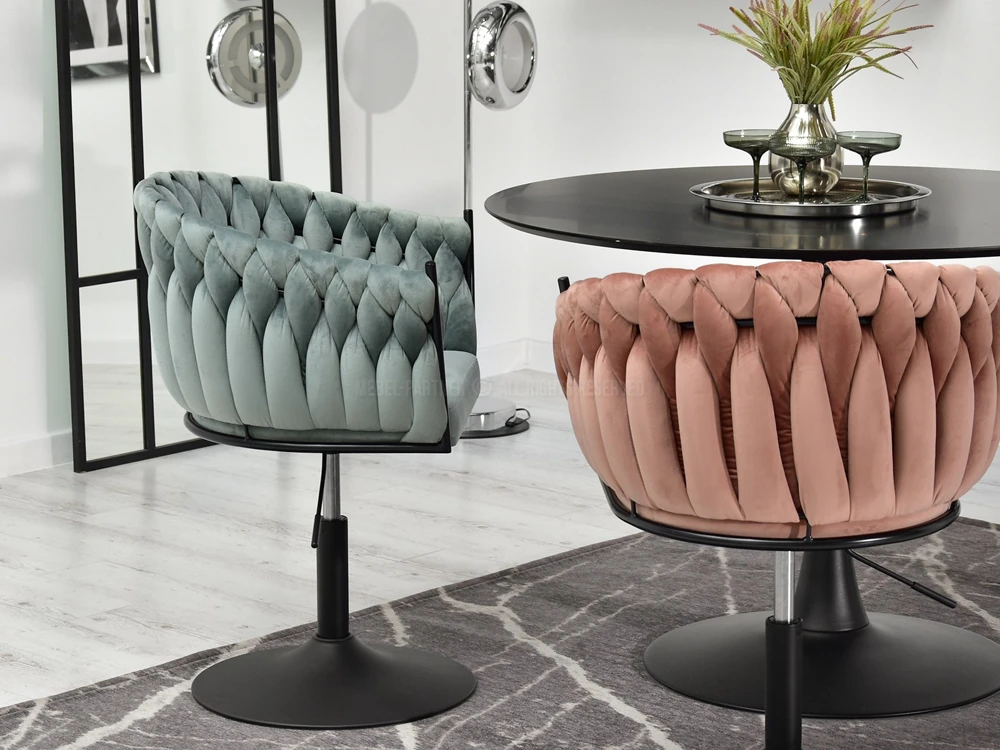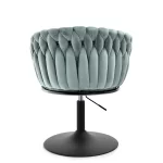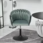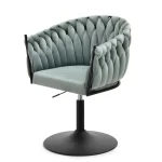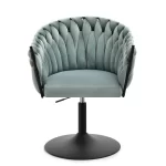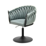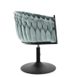 Okreten Zoe Ring se bo uspešno prilegal v notranjost klubov, kavarn in jedilnic, lepo pa bo izgledal tudi kot toaletni stol ali stol za garderobo. Da bi poudarili edinstveno obliko školjke, je fotelj prevlečen z mehkim velurjem Riviera v nežni mint barvi. Elegantno telo sedeža je postavljeno na nogo z okroglo nogo iz črnega prašno lakiranega jekla. Noga ima na spodnji strani plastični nastavek, ki preprečuje poškodbe podlage, montira pa se enostavno – s pomočjo štirih vijakov. Globina sedišča, nasloni za roke, možnost obračanja in nastavitve višine omogočajo udobno uporabo. Ročno izdelana pletenica okoli črnega okvirja preseneti z natančnostjo tkanja in doda edinstven značaj in lepoto stola, gledanega z vseh strani.