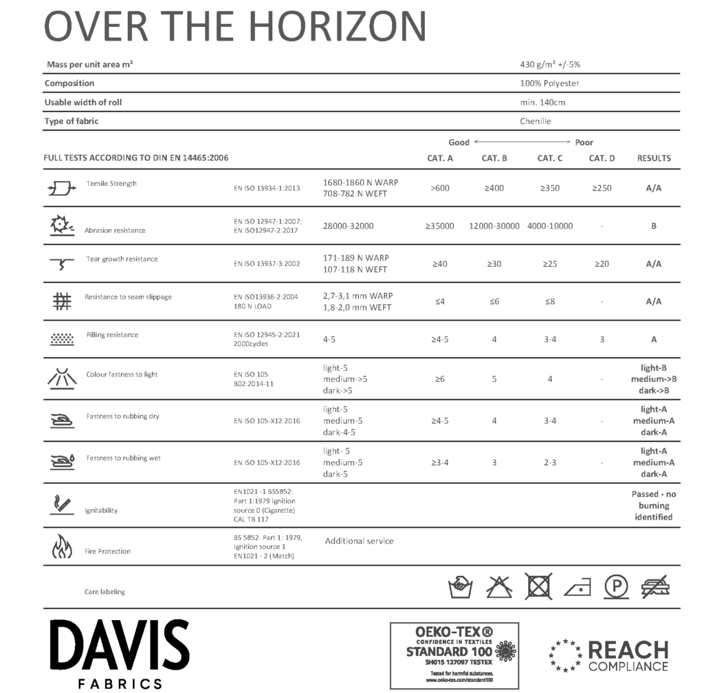 Kolekcija Over the Horizon predstavlja elegantno in moderno tkanino z žametnim značajem, ki izstopa po svoji zanimivi strukturi in izvirnem videzu. S 17 sodobnimi barvami, ki so na voljo, ta prožna tkanina zagotavlja močno in vzdržljivo tekstilno možnost.